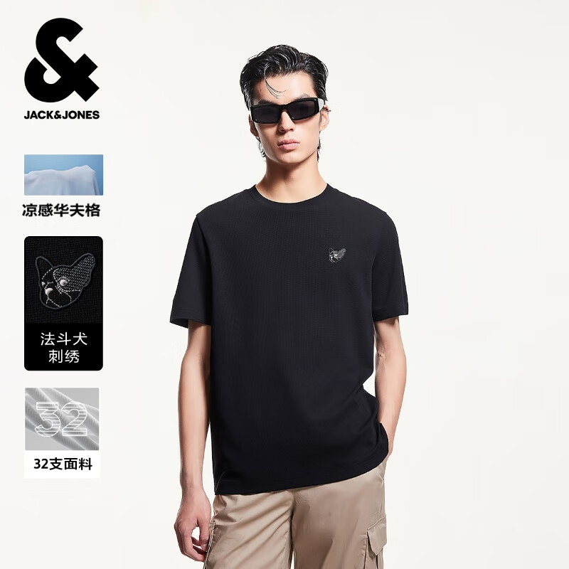杰克·琼斯(JACK&JONES)25年衣服男装短袖t恤男士夏季【凉感】华夫格潮流法斗犬刺绣半袖 E40黑色 常规 M