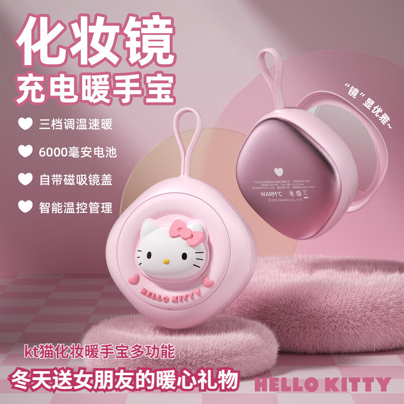 Hello Kitty充电暖手宝化妆镜二合一 女生可爱学生党生日礼物情人节礼物库洛米暖手宝容量便携三档速暖充电式 粉色 凯蒂猫暖手宝 大容量6000mAh+磁吸化妆镜+礼袋套装