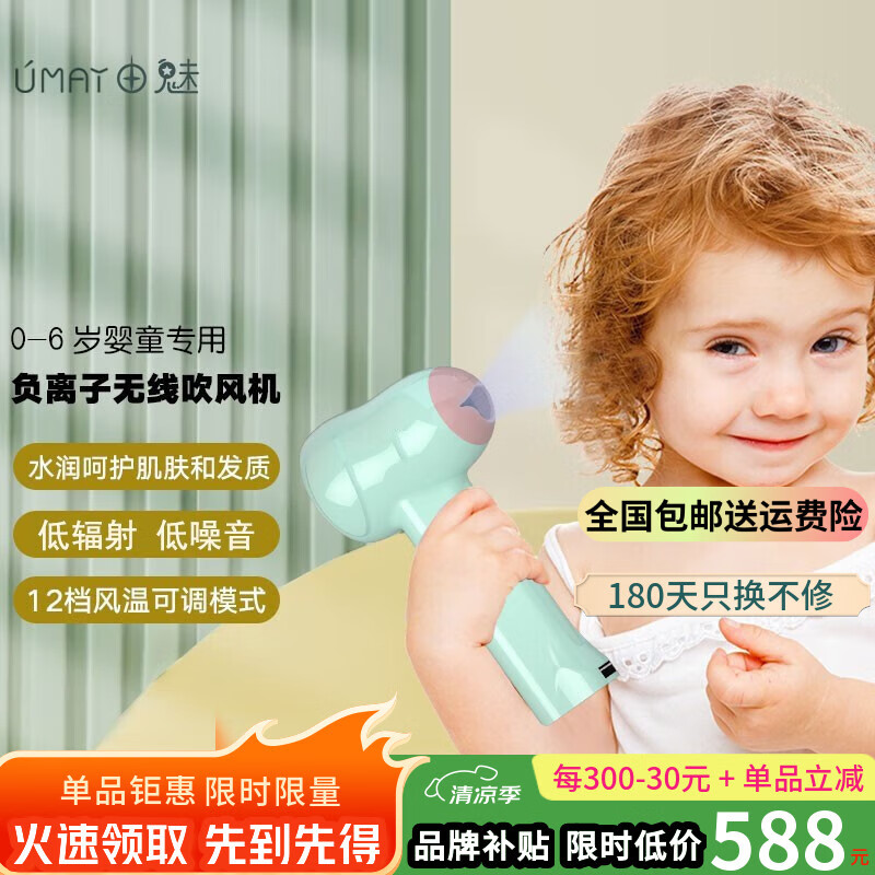 由魅(umay) 婴儿无线吹风机宝宝专用恒温低辐射便携式负离子电吹风儿童吹屁屁充电式大功率吹风筒 【小七-双电池款】