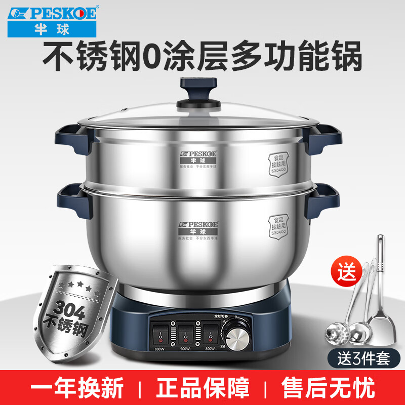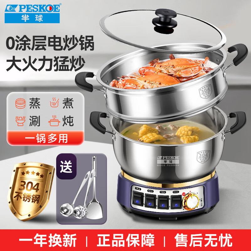半球(PESKOE)电炒锅电蒸锅电煮锅电炖锅电火锅炒菜锅大功率大容量蒸笼加厚整锅304不锈钢多功能锅多用途锅 5.5L 【整锅304定时款】34CM【双蒸笼】