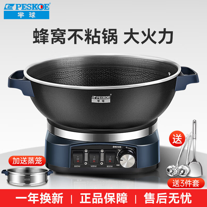 半球(PESKOE)电炒锅电火锅电炖锅蜂窝不粘多功能家用炒菜锅专用电锅多功能锅电煮锅电蒸锅蒸煮电热锅蒸笼大功率 6L 【蜂窝不粘】标准款-36cm【双蒸笼】