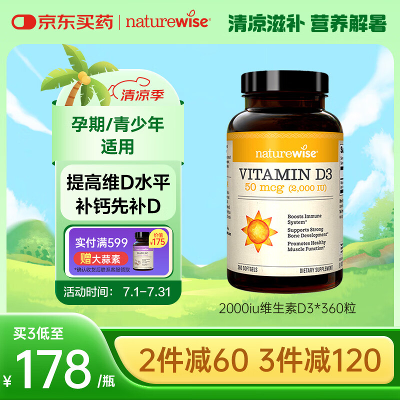 Naturewise阳光瓶2000iu活性25羟基维生素D3软胶囊 360粒/瓶(成人/备孕/孕期/青少年)
