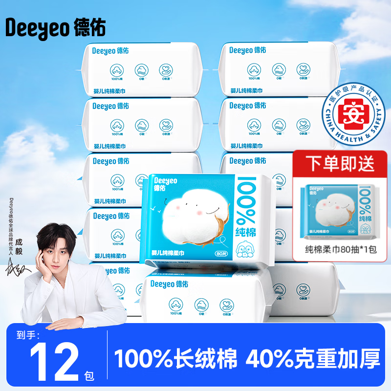 德佑纯棉婴儿棉柔巾干湿两用擦脸巾抽取式新生儿专用一次性洗脸巾 【棉新生儿S码】80抽*12包