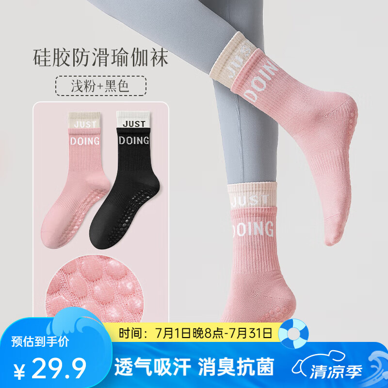棉竹屋2双瑜伽袜女吸汗7A抗菌中筒袜防滑硅胶健身普拉提女运动束腰 组合二黑色+浅粉 2双 均码 35-39