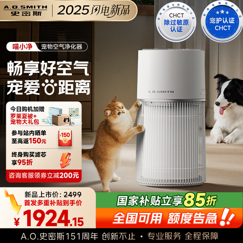 史密斯(A.O.SMITH)重磅上新【国补不限区域】宠物空气净化器喵小净 吸猫毛除甲醛过敏源杀菌消毒除异味 KJ390F-D21