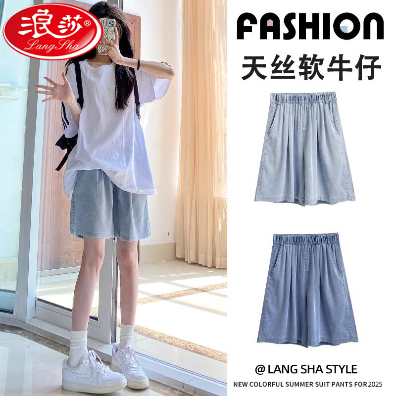 浪莎天丝牛仔短裤女夏季薄款高腰垂感百搭显瘦休闲裤子宽松阔腿五分裤 浅蓝色【升级莱赛尔冰凉面料】 2XL 【适合131-140斤】