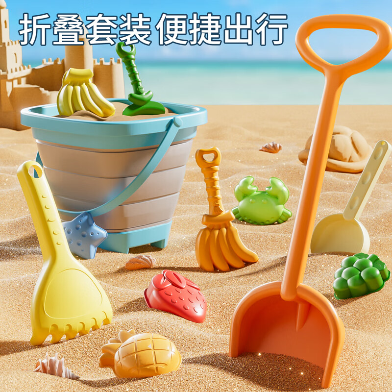 【15.8包邮】知贝 儿童沙滩玩具 【蓝色】折叠大桶+3铲子+4模具