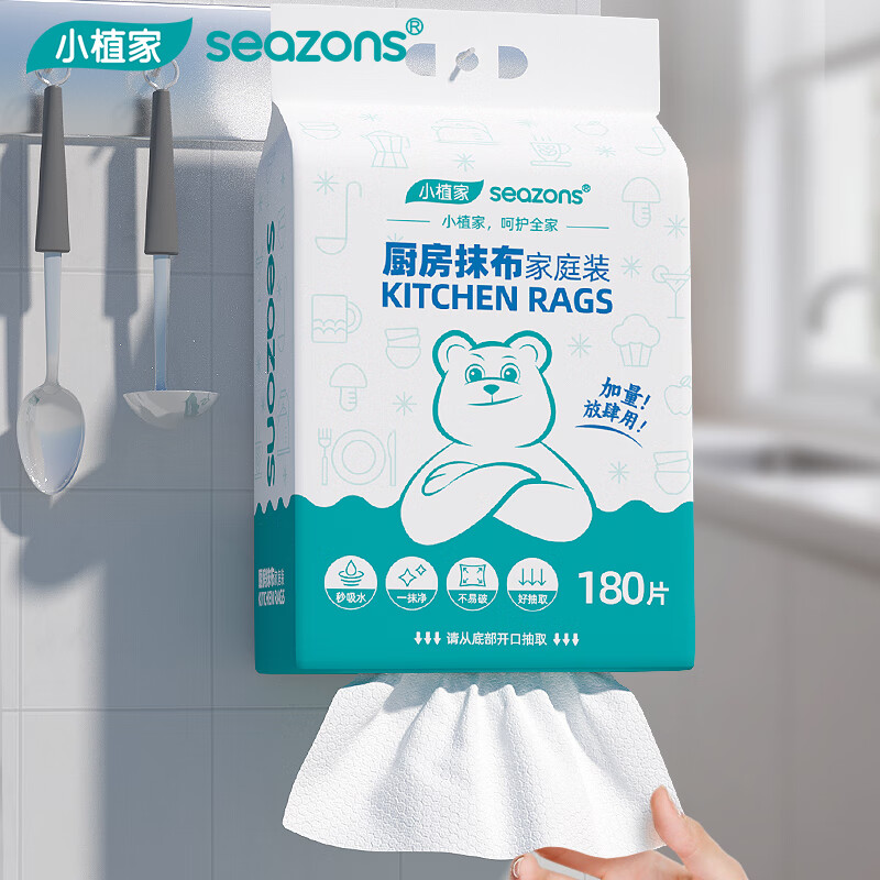 推荐理由 :即抽即用,不沾油,吸水量足,不掉屑,一冲即净,强力去污,一次性懒人抹布,可反复使用。