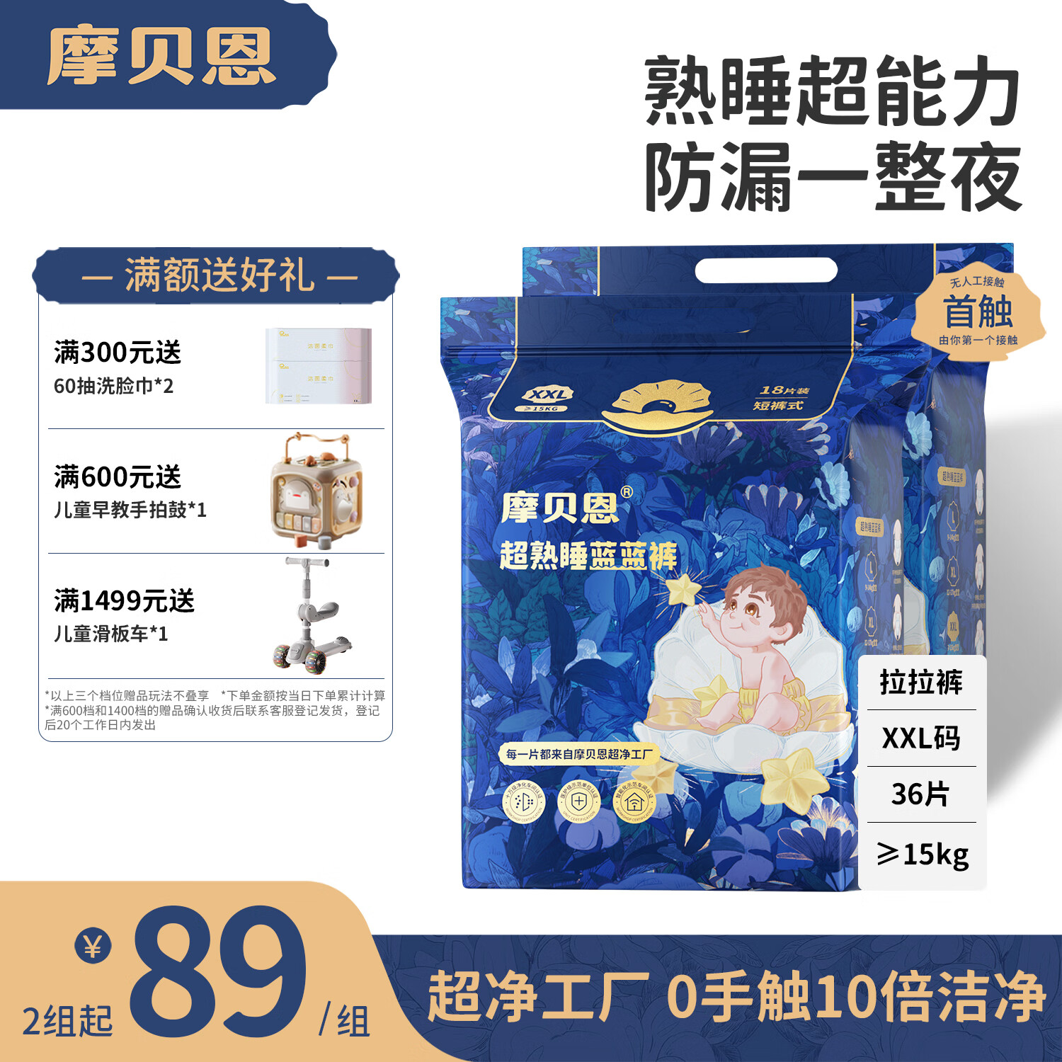 摩贝恩【超净工厂10倍洁净】蓝蓝裤宝宝婴儿尿不湿拉拉裤XXL码18片*2包