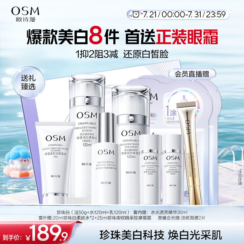欧诗漫(OSM)珍珠白洁面爽肤水乳液精华套装美白淡斑护肤品面膜眼霜生日礼物