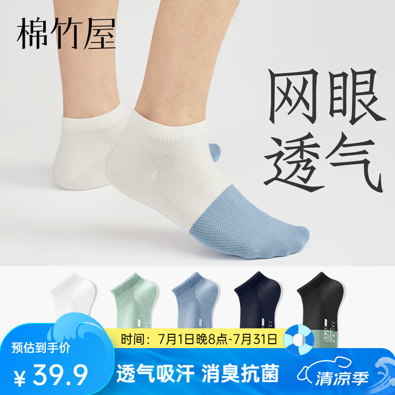 棉竹屋袜子男夏季薄款网眼短袜7A抗菌防臭男运动防滑不掉跟拼色 白色+森绿+天蓝+蔚蓝+黑色 均码 39-44
