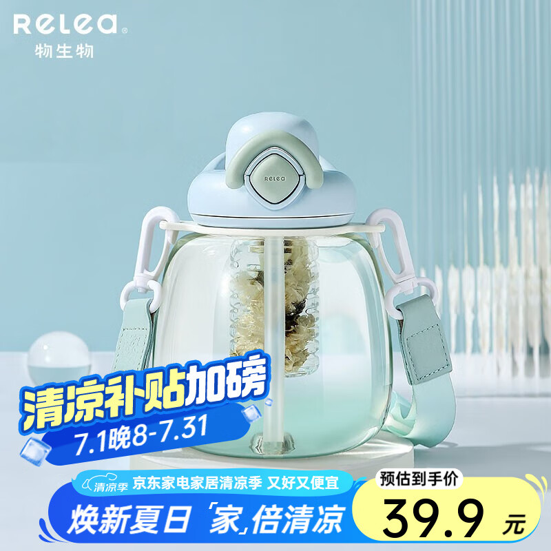 物生物(RELEA)大肚杯女水杯大容量高颜值塑料杯夏季运动儿童水壶学生吸管杯子 奶莹蓝1000ml【tritan材质】
