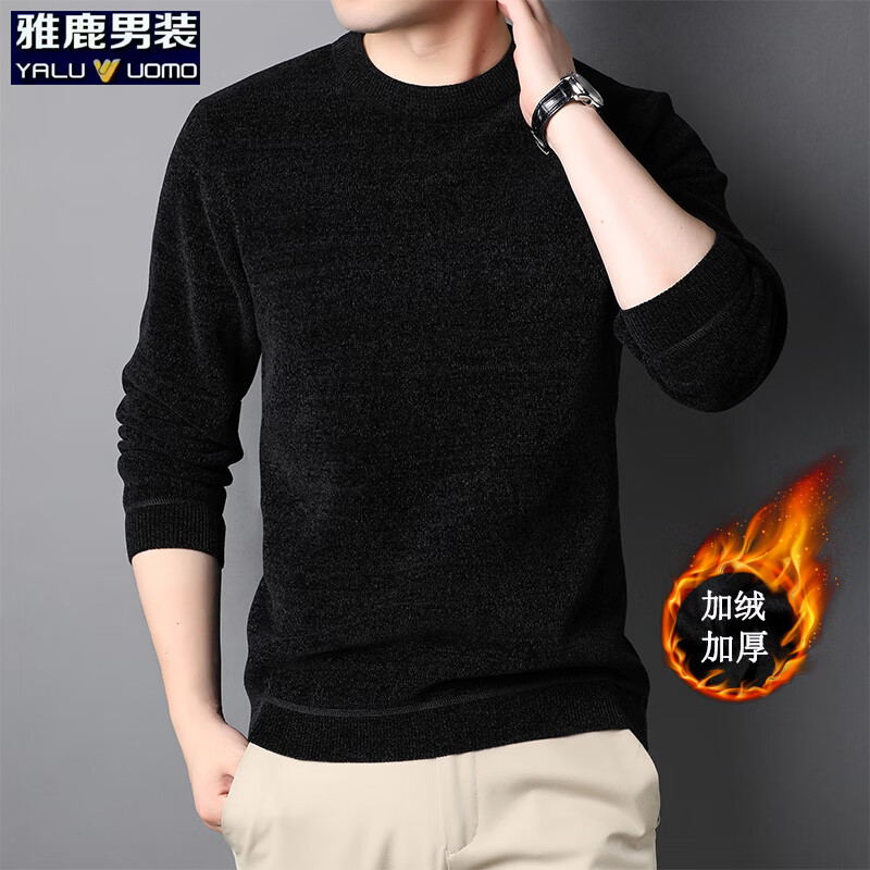 罗蒙(ROMON)仿雪貂绒圆领针织衫男2024秋冬新款中青年纯色加绒加厚打底毛衣男 灰色 3XL (185) (建议155-175斤)